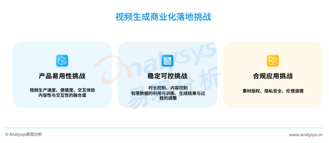 虽然人工智能技术在视频生成方面已经取得了一定进展,但现阶段模型的生成效果并不理想,能够同时在视频长度、逼真度、连贯性三个维度上均达到商用水平的视频生成产品仍然欠缺。除了算法模型层面的探索,在实际应用中需要平衡模型性能与生成效率之间的关系,根据不同行业和场景的用户需求对产品能力给予不同侧重,包括产品是否易于使用或部署、生成结果是否稳定可控、是否涉及技术应用风险等,因此在落地过程中,需要考虑来自易用性、可控性、合规性三个方面的挑战,这也决定了视频生成产品未来的商业化空间。