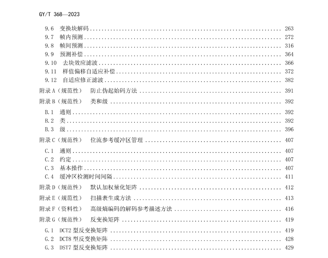 GY/T 368—2023《先进高效视频编码》(简称“AVS3”),规定了适应多种比特率、分辨率和质量要求的高效视频压缩方法编码位流的结构、语法、语义和解析、解码过程。适用于广播电视、网络电视、网络视音频、数字存储媒体、静止图像序列等视频编码。