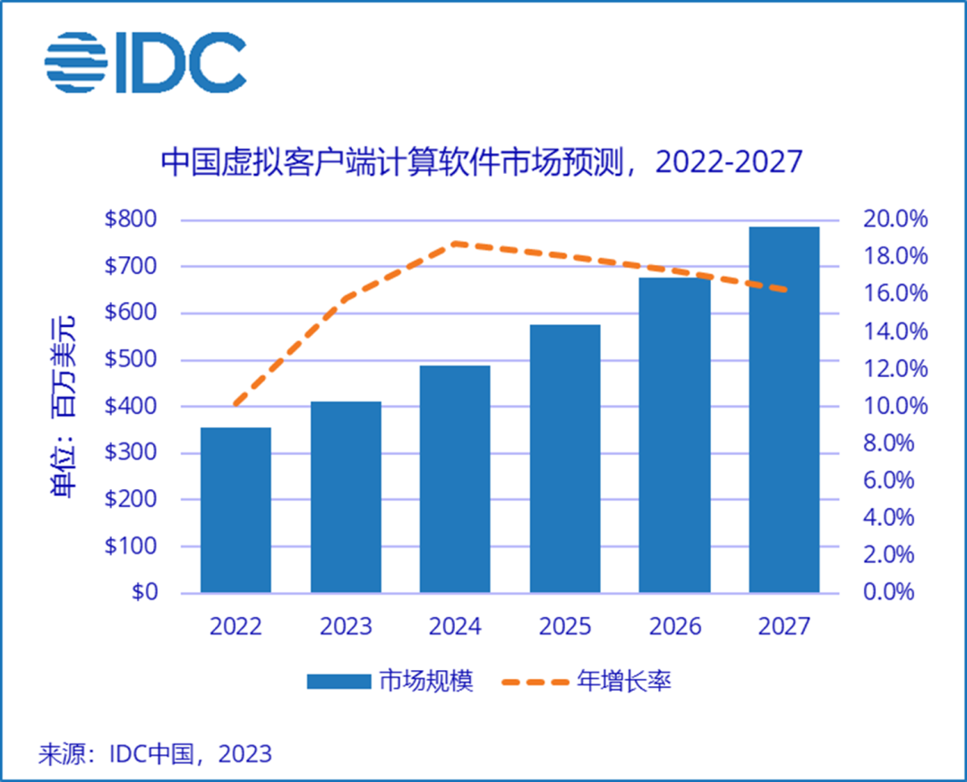 2022年,国内疫情的反复对整体经济产生了负面影响,导致虚拟客户端计算软件市场增速有所下滑。随着市场逐步放开,经济慢慢复苏,将在2023年和2024年逐步恢复增长。