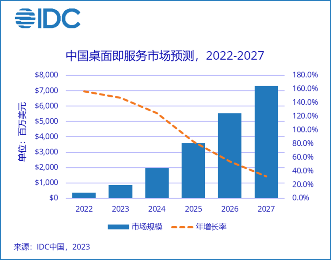 IDC即将发布的虚拟桌面软件及云服务市场半年跟踪报告显示,2022年虚拟客户端计算软件市场的市场规模达到了3.5亿美元,同比增长10.1%;未来五年(2022-2027年)该市场仍然会保持17.2%的年复合增长率,预计2027年将达到7.9亿美元的市场规模。2022年桌面即服务市场的市场规模达到了3.5亿美元,同比增长156.8%;未来五年(2022-2027年)该市场仍然会保持83.3%的年复合增长率,预计2027年将达到73亿美元的市场规模。