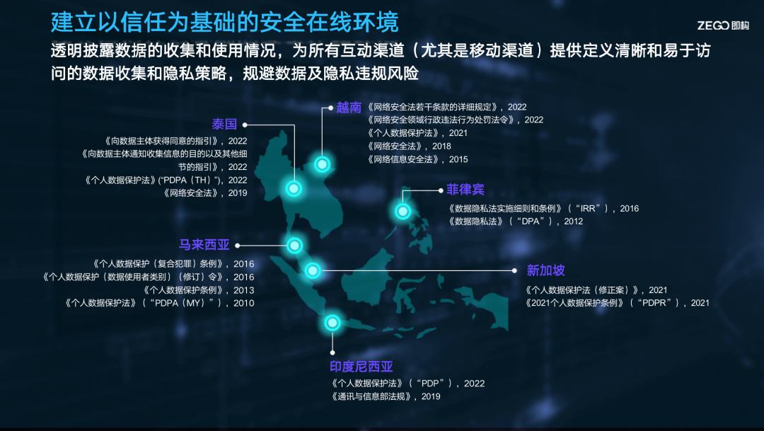 以印尼个人数据保护法为例,拆解政策需要关注的五大维度:适用范围、处理合法性基础、数据主体权利与保护、跨境传输、法律职责承担。需要注意的是,无论出海的目的地是哪一站,目的地周边的相关政策法规的关注和解读同样重要,因为一旦产品或企业实现或完成了区域化,势必要从核心市场辐射周边市场,所以了解和掌握周边国的法规同样重要,每一个法案都可以从以上维度去拆解,规避违规风险 。
