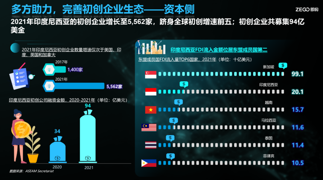 咨询公司贝恩(Bain)2022年3月公布的《2022年东南亚私募股权报告》显示,2021年,东南亚的私募股权总交易额达到250亿美元,比前一年增长了143%,成为历年新高。 印尼初创企业数量从2017年的1400家,迅速增长到2021年的5562家,跻身全球初创企业增速前五,仅次于美国、印度、英国和加拿大。在2021年,印尼初创企业共募集到资金94亿美金,几乎是2020年34亿美金的三倍。