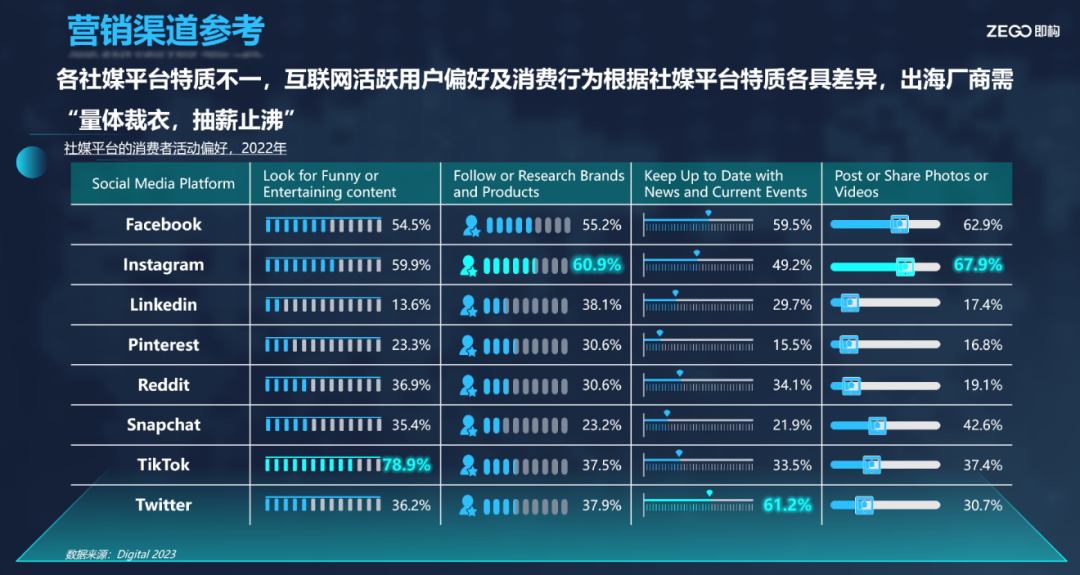 各种社媒特质不一,互联网活跃用户偏好及消费行为根据社媒平台特质各具差异。出海厂商需要“量体裁衣,抽薪止沸”。我们梳理了一些各社媒平台的消费者活动偏好数据,挑选的指标供大家挑选营销渠道做参考。