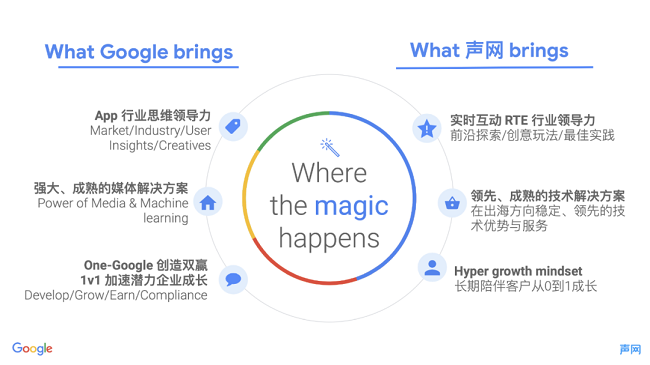 该计划签署后,Google 将为声网客户带来更多专属行业洞见与实践指导,包括全球市场品类趋势、广告产品最佳实践、Google应用商店、广告政策要点、创意素材独家指导。对于优选客户,更将提供定制营销策略规划、1V1 Google Ads教学、产品技术支持等专享服务。