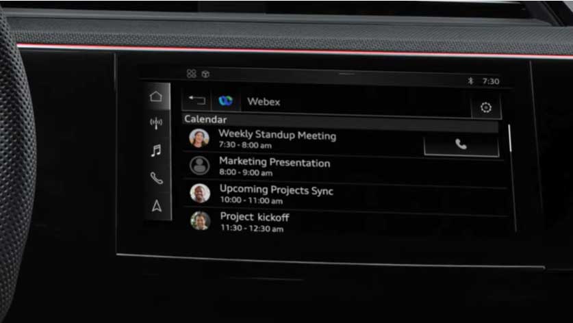 自2023年7月起,可下载Webex应用程序的应用商店将在欧洲、美国、加拿大、墨西哥和海外市场的奥迪A4、A5、Q5、A6、A7、A8、Q8 e-tron和e-tron GT等奥迪新生产车型中提供。