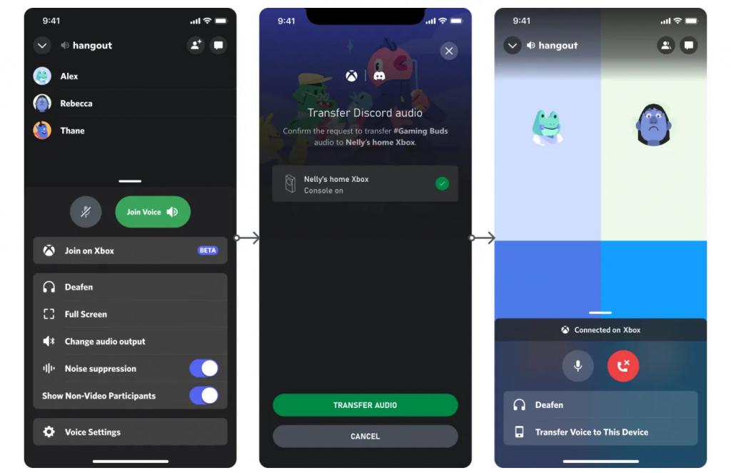 完成绑定之后,如果你想在 Xbox 上用 Discord 与你的小伙伴语音,你可以在 Discord 上开始通话,点击「转移到 Xbox」,然后打开 Xbox 的手机应用,选择你想链接的主机即可。