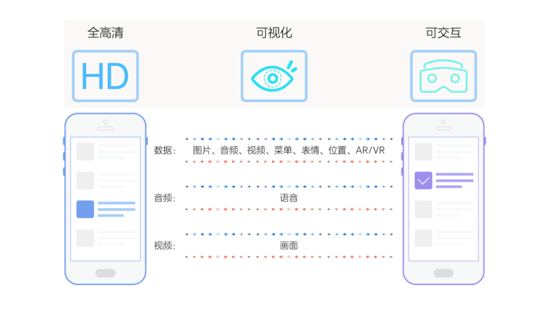 5G新通话通过IMS数据通道,可以传送图片、音频、视频、菜单、表情、位置、动作、AR/VR等多媒体数据,音视频通话和数据通道媒体在终端同步呈现,从而能在高清音视频通话中实现听觉、视觉、触觉、动觉等同步的全沉浸式体验。