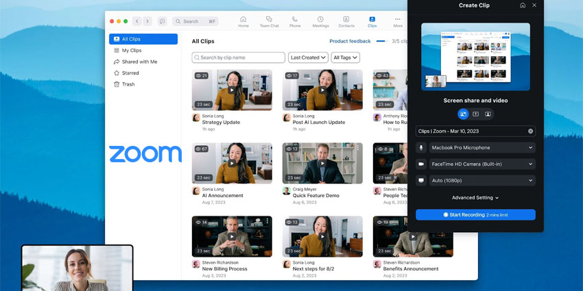 用户可以访问 Zoom Clips,并从 Zoom 桌面应用程序、Zoom 门户网站、Mac 菜单栏或 Windows 系统托盘启动该产品。