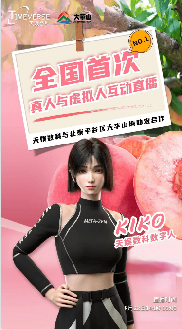近年来大华山镇紧抓网络直播带货商机,筹建了电商中心,打造了网红直播厅,开发线上“淘桃商城”。大华山镇相关负责人表示,作为数字经济的重要环节和元宇宙时代的入口,虚拟数字人产业在直播电商领域的应用价值正逐渐凸显。此次大华山镇联手天娱数科的数字人KiKo,将是业内首次真人与数字人互动直播带货的尝试,也是双方未来达成长期合作的重要契机。