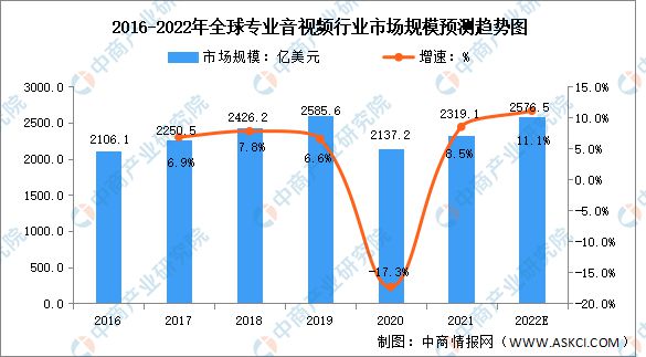近年来,全球专业音视频行业稳步增长,亚太地区增长较快。数据显示,全球专业音视频行业市场规模由2016年的2106.1亿美元增长至2021年的2319.1亿美元,2020年市场规模小幅下降,2021年开始回升。中商产业研究院预测,2022年全球专业音视频行业市场规模将达2576.5亿美元。