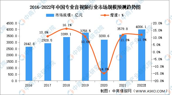 我国专业音视频行业规模不断扩大,市场增速高于全球平均水平。专业音视频系统的应用领域不断扩展,进一步促进了本行业的发展。数据显示,我国专业音视频行业市场规模由2016年的2642.8亿元增长至2021年的3579.8亿元,复合增长率达6.26%。中商产业研究院预测,2022年我国专业音视频行业市场规模将达4006.1亿元。