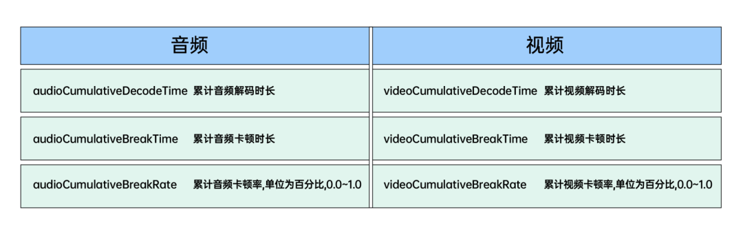功能描述:对齐 Native,拉流质量回调中增加 6 个音视频相关指标。