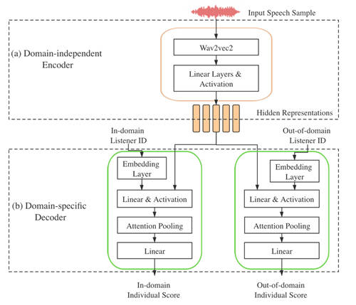 针对两种领域赛道,火山语音团队提出了一种多任务学习方法,利用较多的主领域数据来协助子领域部分模块训练,同时将自动语音识别(Automatic Speech Recognition, ASR)的知识迁移到MOS打分任务。在wav2vec2.0上构建ASR系统,然后将系统wav2vec2.0部分作为MOS打分模型的编码器,通过两种不同领域的解码器来对不同领域的数据进行MOS评分。