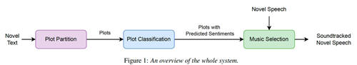 具体来说该系统可以分为情节划分(Plot Partition)、情节分类(Plot Classification) 和 音乐选择(Novel Selection) 三个部分。前两部分主要通过NLP技术实现了篇章级语意理解,能够自动将小说文本进行片段式的情节划分,做到预测多达十二类的情节;第三部分则实现了基于语意及小说音频长度的启发式规则,自动化地从音乐库中选择合适的音乐片段并与小说音频进行自动混音。该系统在与人工配乐的对比实验中,目前的合格率已追平人工水平(均为88.75%);优秀率也高达45%,但对比人工 52.5%的数据指标还略有差距。