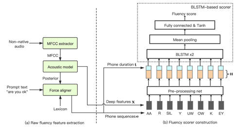 对此火山语音团队提出了一种基于原始序列特征的英语口语流利度建模方法,利用原始序列特征来替换传统的手工设计特征,如语速,停顿次数等,即在音素层级提取出音素时长以及声学特征并对其进行建模;此外还将静音作为一种特殊音素,用于表征词和词之间的停顿现象。