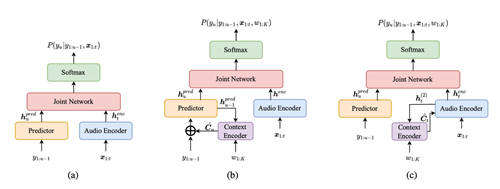 (a)基础 RNN-T 结构 (b)引入对话历史到 predictor 的结构 (c)引入对话历史到 encoder 的结构
