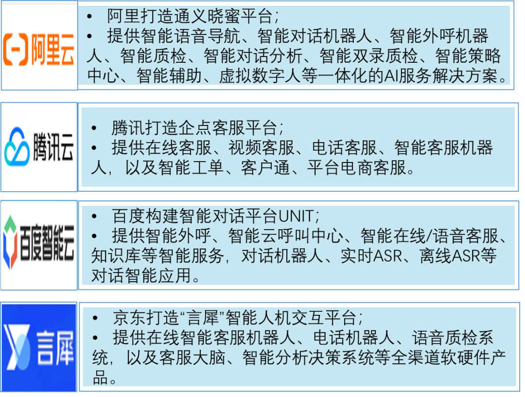 头部互联网企业均打造了产品体系完善的智能客服平台,提供闭环服务能力。阿里打造通义晓蜜平台,提供智能语音导航,智能对话机器人、智能外呼机器人、智能质检、智能对话分析、智能双录质检、智能策略中心、智能辅助、虚拟数字人等一体化的AI智能客服解决方案。腾讯打造企点客服平台,提供在线客服、视频客服、电话客服、智能客服机器人,以及智能工单、客户通、平台电商客服。百度构建智能对话平台UNIT,提供智能外呼、智能云呼叫中心、智能在线/语音客服、知识库等智能服务,对话机器人、实时ASR、离线ASR等对话智能应用。京东打造“言犀”智能人机交互平台,提供在线智能客服机器人、电话机器人、语音质检系统,以及客服大脑、智能分析决策系统等全渠道软硬件产品。