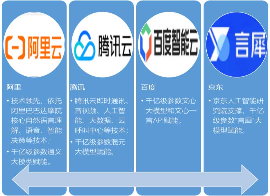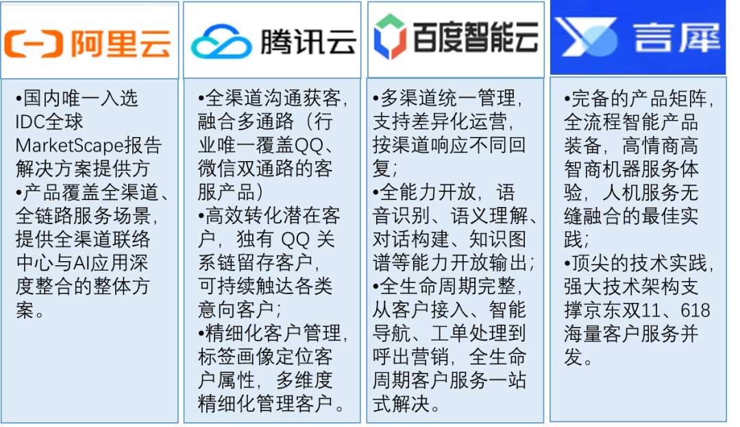支持语音、文本、视频等全媒体接入,支撑网站、公众号、微信客服、邮件、短信、外呼、语音等全渠道服务;功能从服务向营销延伸,拉通业务流程环节,在线一次解决率高。阿里通义晓蜜,覆盖全渠道、全链路服务场景,提供全渠道联络中心与AI应用深度整合的整体方案。腾讯企点,全渠道沟通获客,融合多通路(行业唯一覆盖QQ、微信双通路的客服产品)。百度,多渠道统一管理,全生命周期客户服务一站式解决。京东,完备的产品矩阵,全流程智能产品装备。