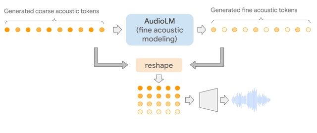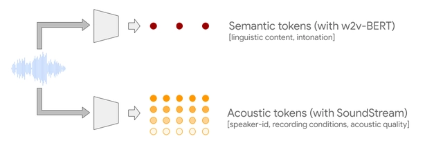 语义令牌(语义标记来自音频框架 w2v-BERT)捕获语音、旋律等局部依赖性和语法、和声等全局长期结构。但是,语义令牌创建的音频保真度较差。因此谷歌还利用了由 SoundStream 神经编解码器生成的声学令牌,该令牌捕获音频波形的详细信息。