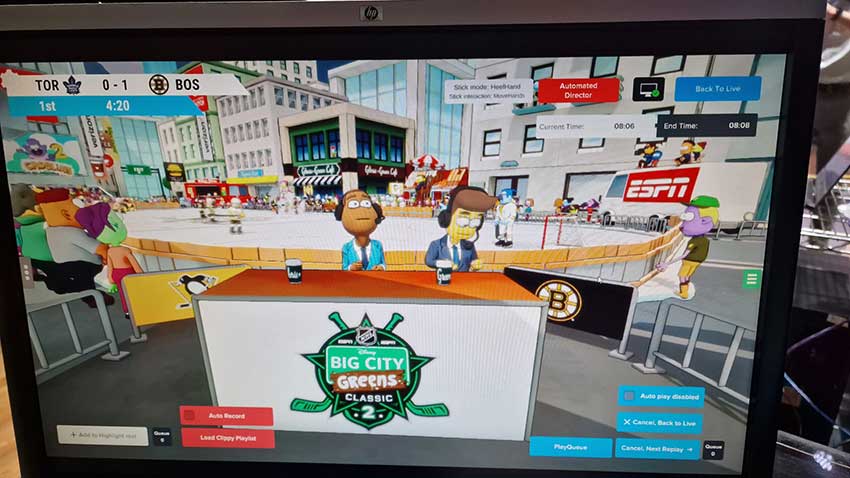 在企鹅队与布鲁斯队的比赛中,ESPN 和 NHL 找来了 Beyond Sports(索尼旗下公司)为冰上球员制作现场实时体积动画,ESPN Creative Studio 与迪斯尼品牌电视公司合作设计了动画转播的整体外观。