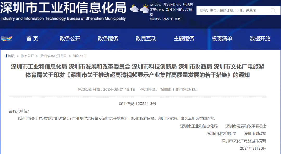 为贯彻落实深圳市委、市政府关于“20+8”战略性新兴产业集群和未来产业发展的规划和部署,推动超高清视频显示产业集群高质量发展,2024年3月20日,深圳市工业和信息化局等五部门印发《深圳市关于推动超高清视频显示产业集群高质量发展的若干措施》(以下简称“《措施》”)。