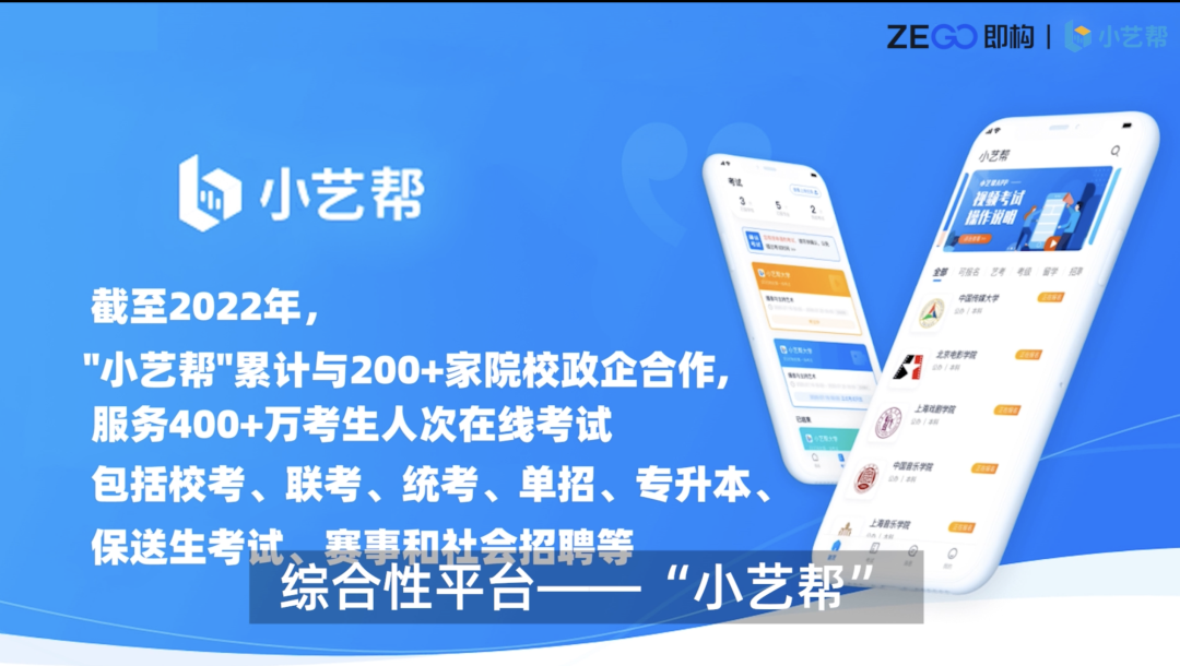 2018年,ZEGO即构科技通过自研RTC技术,结合丰富的在线考试行业经验,打造集考试、监考、评分为一体的综合性平台——“小艺帮”。截至2022年,“小艺帮”累计与200+家院校政企合作,包括上中国传媒大学、北京电影学院等顶尖艺术学府,服务400+万考生人次在线考试,成为国内最大的在线视频考试平台。