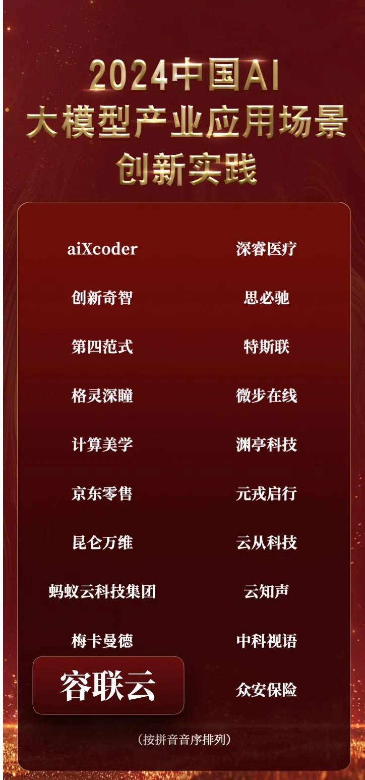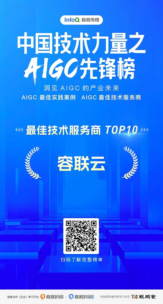 2024年,容联云持续深入行业场景,并真正让企业级应用落地,让企业用户“用起来”,让效果“看得见”,容联云凭借容犀智能产品矩阵,分别荣获InfoQ 中国技术力量之【AIGC 最佳技术服务商 TOP10】、甲子光年【2024大模型产业应用场景创新实践】两项殊荣。