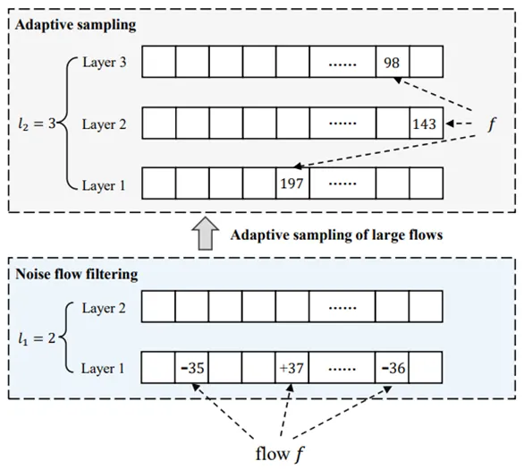 (1) 创新性地提出了一种能根据流大小自适应分配存储空间的自适应Sketch技术。该技术利用可逆计数器高效滤除高速网络中的海量噪声小流,并利用由一组采样频率逐层递减的采样计数器实现对不同规模流的自适应采样,以尽可能小的存储代价满足不同规模流对估计区间和估计精度的要求。