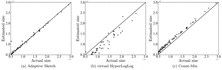 本文实验使用 2019年CAIDA监听的匿名流量数据作为流大小估计的测试数据,该测试数据共包括147M个数据包,486K条流。本文与经典算法Count-Min和virtual HyperLogLog (vHLL)进行对比。实验结果表明自适应Sketch方法在流大小估计上,相对于同类方法具有更优的估计精度。