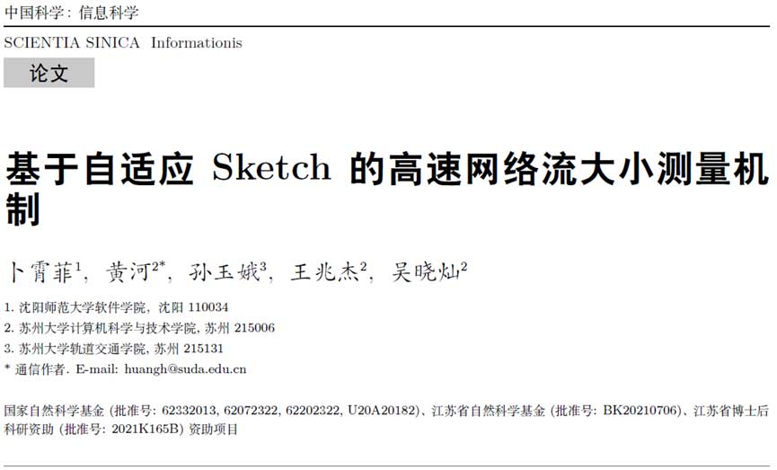 卜霄菲,黄河,孙玉娥,王兆杰,吴晓灿. 基于自适应 Sketch 的高速网络流大小测量机制. 中国科学:信息科学, 2024, doi: 10.1360/SSI-2023-0294