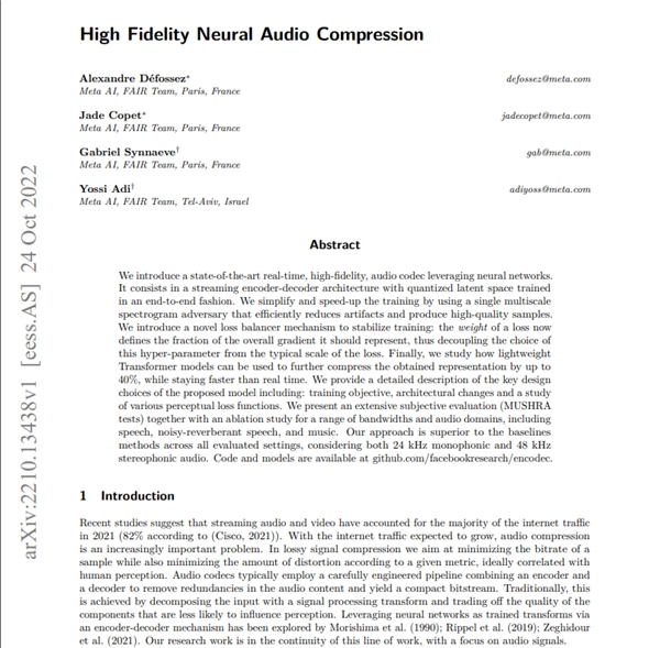 11月6日消息,近日,Meta公布了一项名为“EnCodec”的AI语音压缩技术,该技术号称可以64kbps的速度压缩比MP3格式小10倍的音频,同时还能保证不会损失质量。