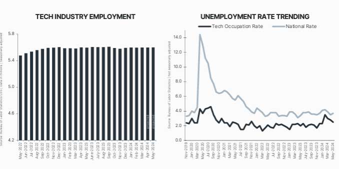 - 整个经济中的科技职业减少了 42,000 个。不过,科技行业的失业率仍降至 2.5%,低于全国 4% 的失业率。