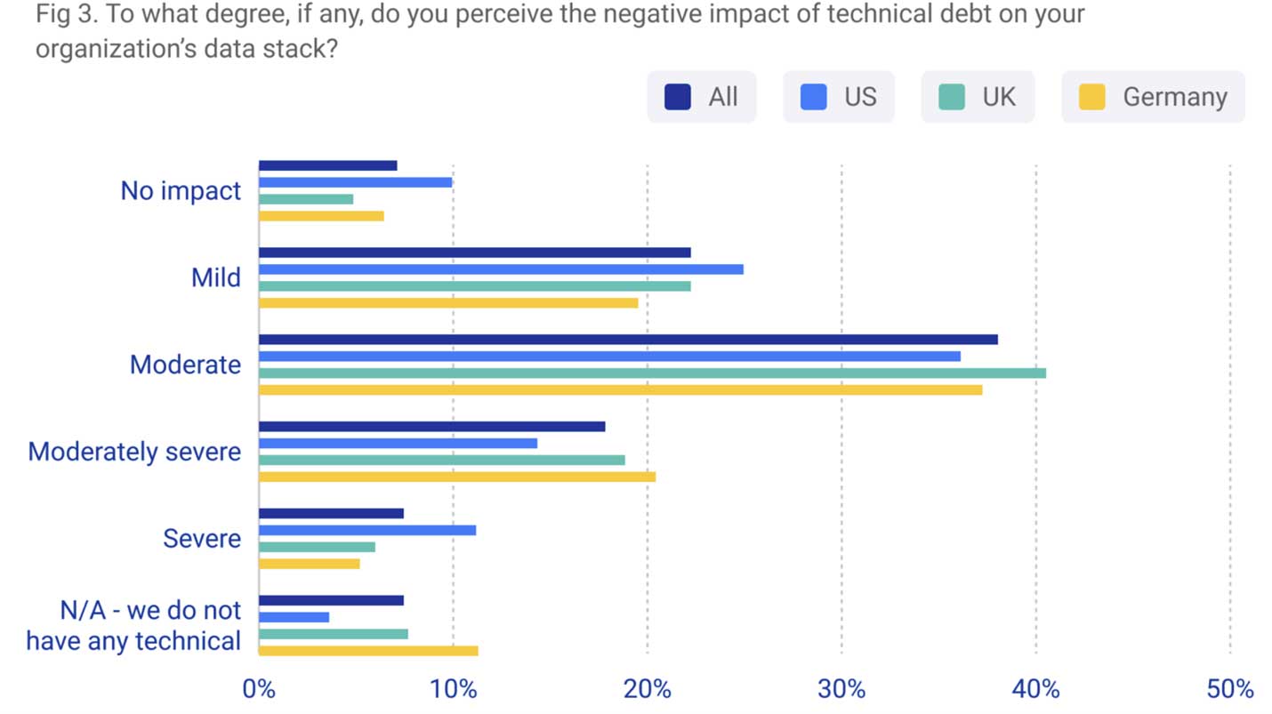 SnapLogic 发布一项名为 “The Code to Unlock Gen AI “的调查发现,63% 的受访公司报告了技术债务带来的 “中度 “至 “严重 “负面影响,即维护和更新过时的遗留系统所需的成本。这些负面影响包括建立数据孤岛、转移资源和降低效率。