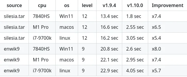 Yann Collet 的基准测试显示,LZ4 1.10 在多线程下处理各种数据和 Windows / macOS / Linux 上的 Intel / AMD / Apple 处理器时速度提高了 5.4~8.0 倍。现在,任何现代 CPU 上的 LZ4 多线程压缩都应该比以前的版本快得多。LZ4 解压缩也可以通过重叠解压缩提高约 60% 以上,但不如压缩加速那么重要。LZ4