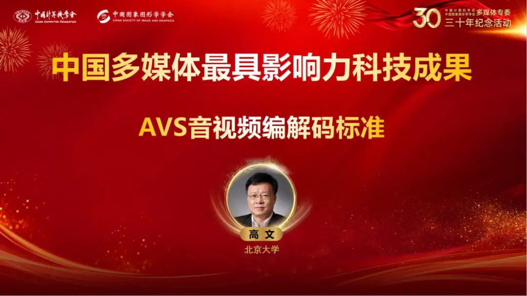 7月24日,在CCF/CSIG多媒体专委会三十年纪念活动上,经表彰工作组提名,指导委员会审议,“AVS 音视频编解码标准”被评选为“中国多媒体最具影响力科技成果”。