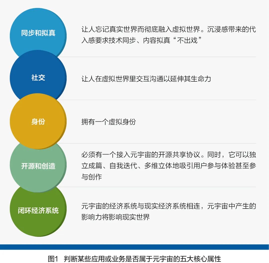 因为根据最具代表性的元宇宙定义之一——一个平行于现实世界,又独立于现实世界的虚拟空间,是映射现实世界的在线虚拟世界,是越来越真实的数字虚拟世界——Avatar是存在于元宇宙中的一个虚拟化身,而衡量一个公司的某些应用或业务是否属于元宇宙,主要看它是否具备身份、社交、开源和创造、同步和拟真、闭环经济系统五大核心属性(见图1)。