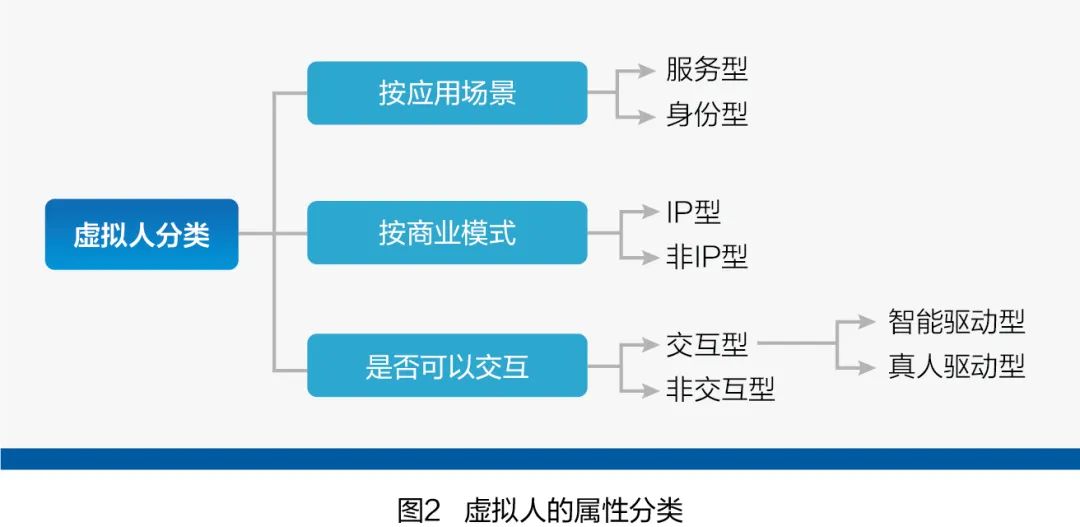 要“看懂”虚拟人进入元宇宙的路径,从元宇宙企业对现实世界里的虚拟人如何进行属性分类便可一窥究竟。目前,元宇宙企业习惯将虚拟人按照应用场景、商业模式以及是否可以交互三个角度进行属性分类(见图2)。