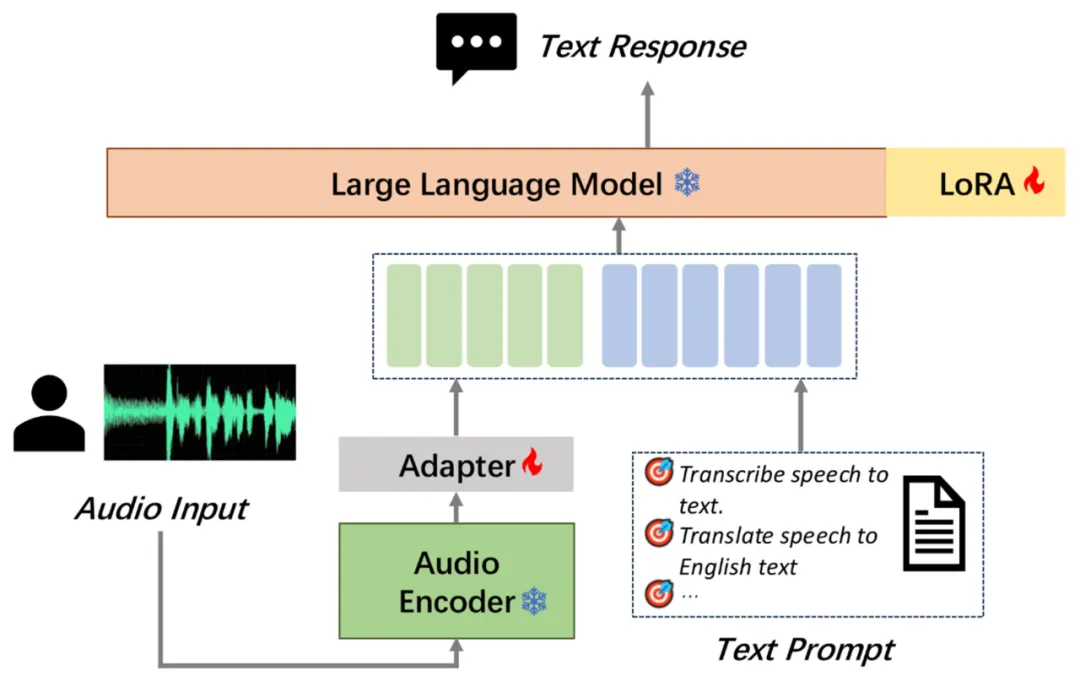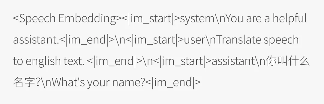 MooER的模型结构包括Encoder、Adapter和Decoder(Large Language Model,LLM)三个部分。其中,由Encoder对输入的原始音频进行建模,提取特征并获取表征向量。Encoder的输出会送到Adapter进一步下采样,使得每120ms音频输出一组音频Embedding。音频Embedding和文本的Prompt Embedding拼接后,再送进LLM进行对应的下游任务,如语音识别(Automatic Speech Recognition,ASR)、语音翻译(Automatic Speech Translation,AST)等。在模型训练阶段,融合了语音模态和文本模态的数据会按以下形式输入到LLM:
