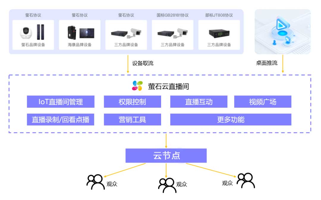 萤石云直播间服务主要面向企业级用户,免开发可直接集成使用,适用多终端地址,解决各类场景下大并发需求,直播视频可实现: