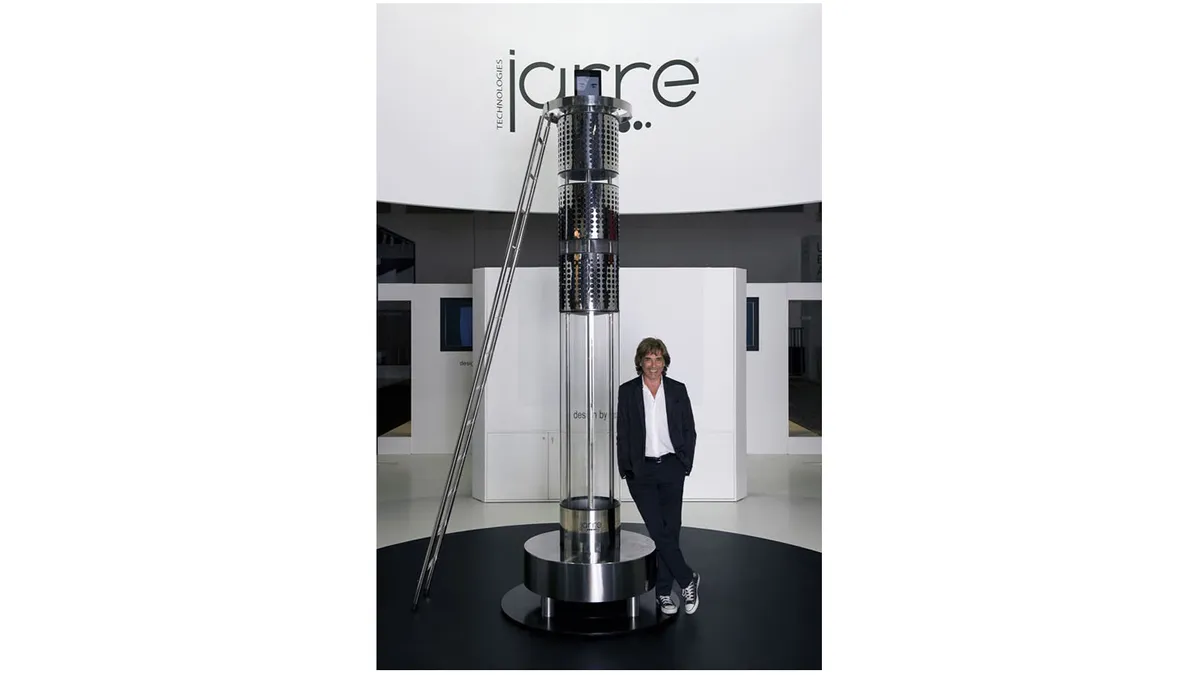 那就是 AeroDreamOne,这是法国音乐家 Jean Michel Jarre 设计的一款原型扬声器系统,功率达 10,000 瓦,重 394 公斤,高 11 英尺。当然,你需要借助梯子才能爬到顶部,以便将 iPod 或 iPad 插入其中。