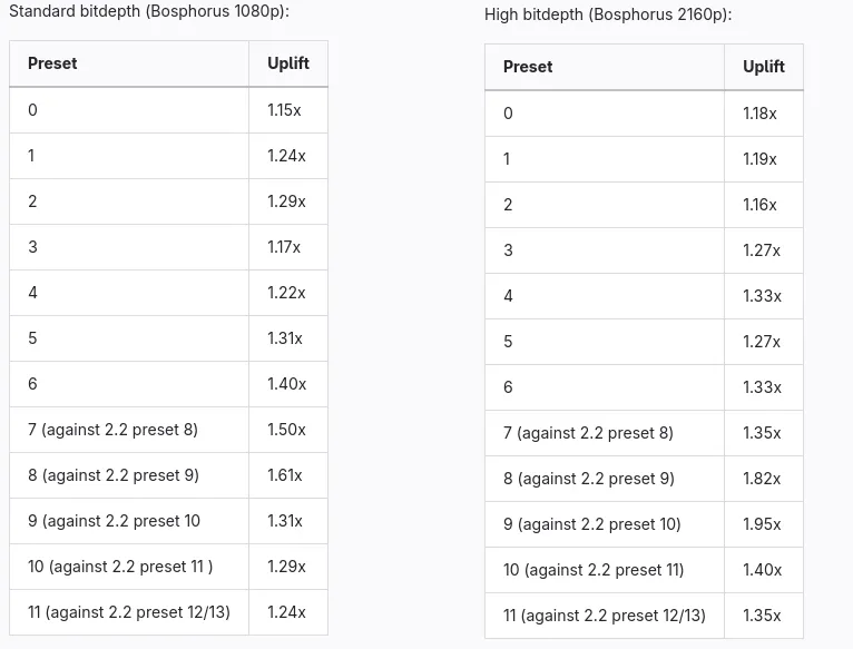 - 全新快速解码 (2) 可将 AV1 软件周期平均减少 25-50% 与快速解码 0 相比,在预设范围内 BD-Rate 损失为 1-3%