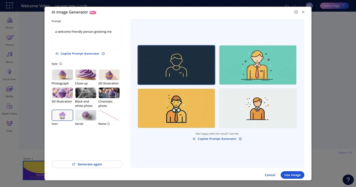 只需几个简单的提示,AI Copilot 便可生成与视频基调、旁白和品牌形象相符的图像。这种方法让各种技能水平的用户都能制作出专业品质的视频,而无需大量的技术专业知识或设计技能。