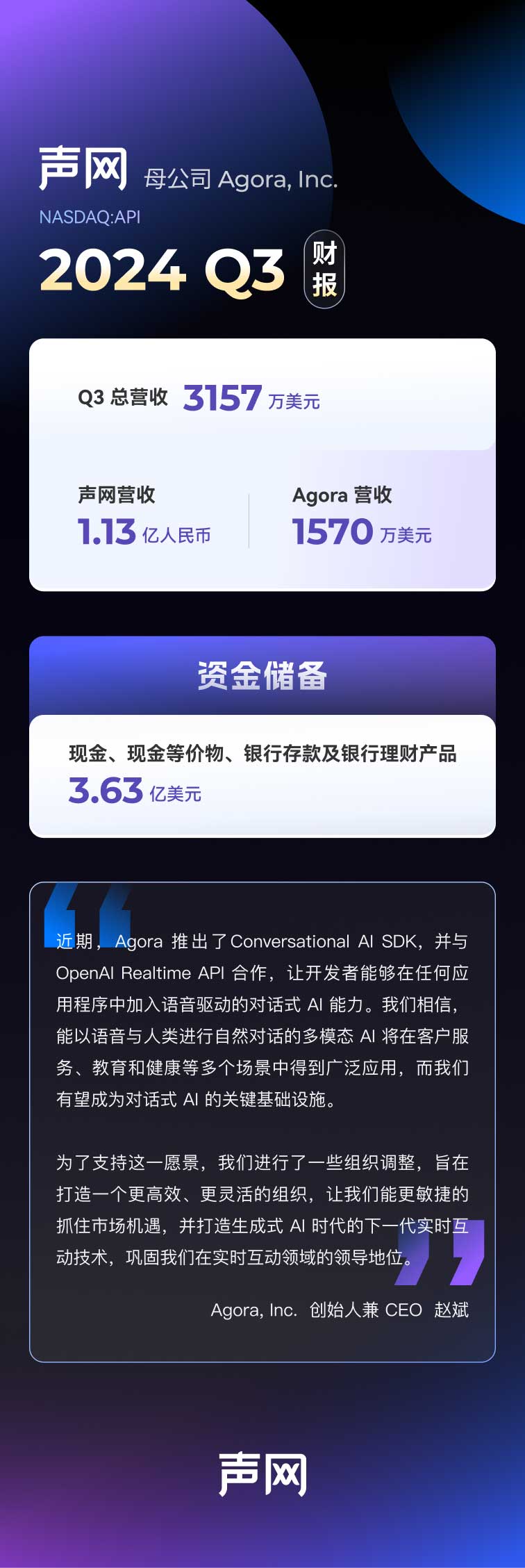 在资金储备方面,财报显示截至2024年9月30日,Agora, Inc. 现金、现金等价物、银行存款及理财产品3.63亿美元。