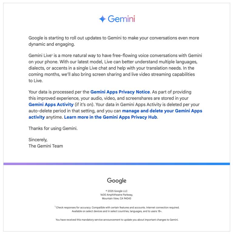 电子邮件更新还预览了即将推出的两项 Gemini Live 新功能:屏幕共享和实时视频流。它传达了 Gemini Live 的新数据共享设置,并指出用户的音频、视频和屏幕共享将由 Google 存储。