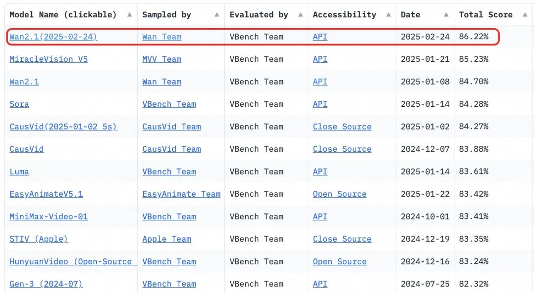 14B版本万相模型在指令遵循、复杂运动生成、物理建模、文字视频生成等方面表现突出,在权威评测集Vbench中,万相2.1以总分86.22%大幅超越Sora、Luma、Pika等国内外模型,稳居榜首位置。