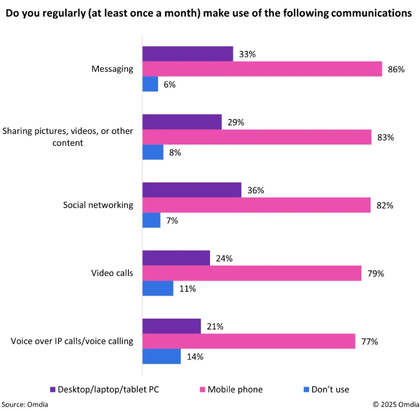《2024年数字消费者洞察:高级通信与消息应用》显示,手机仍然是大多数消费者日常通信的重要组成部分,无论是发送信息、分享内容、使用社交媒体、进行视频通话还是进行语音通话。