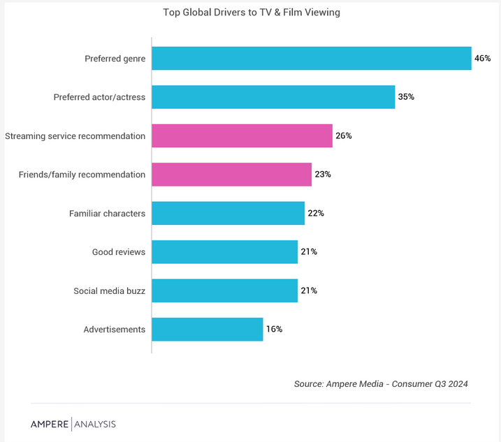 根据 Ampere 的消费者数据,现在越来越多的观众信任流媒体平台提供的个性化建议,而不是传统的热门推荐——来自朋友和家人的推荐。