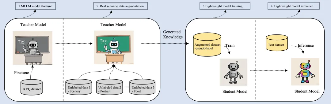 团队首先设计了一个强大的教师模型(包含MLLM多模态大模型以及多种强大的骨干网络),通过多维度的特征提取全面捕捉UGC视频的质量特性: