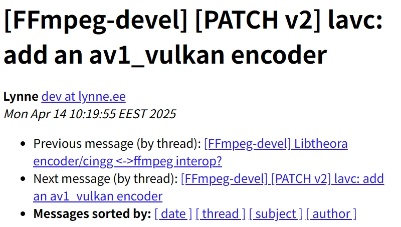 FFmpeg 开发人员 Lynne 负责了这个开源多媒体项目的大部分 Vulkan 视频工作,也是他提出了 AV1 Vulkan 编码器支持。