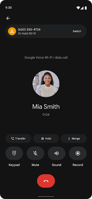 通话界面也进行了重大更新。现在,它提供了更简洁的设计,布局与 Google Meet 类似。关键通话控制键(例如键盘和静音按钮)清晰可见。其他功能(例如保持、转接和合并)也易于查找和使用。通知(例如参与者处于保持状态)现在显示在屏幕顶部。